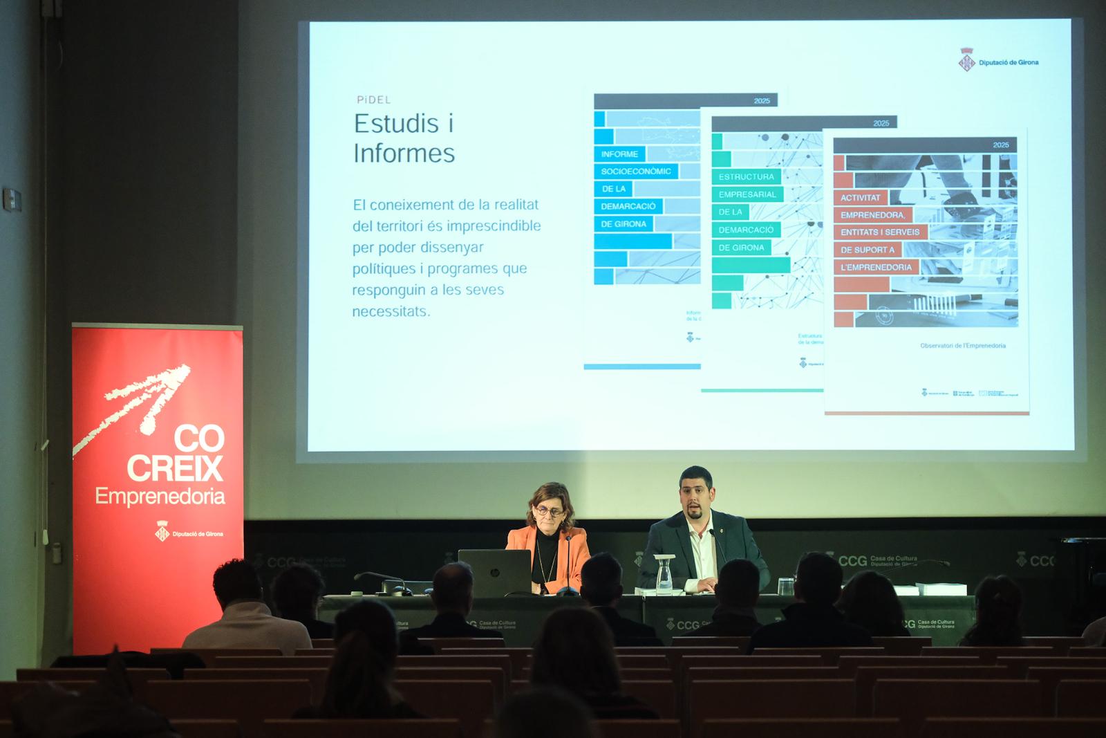 El vicepresident primer i diputat de Promoció i Desenvolupament Econòmic Local, Pau Presas, i la cap del servei, Helga Nuell, han presentat aquest dijous al matí a l’aula magna de la Casa de Cultura de la Diputació de Girona tres estudis que radiografien la realitat socioeconòmica de la demarcació i del seu teixit empresarial i que ens ofereixen una pinzellada del món de l’emprenedoria al territori. Són tres informes que ha elaborat durant aquest 2025 el servei de Promoció i Desenvolupament Econòmic Local i que permeten conèixer amb precisió la realitat territorial. D’aquí que, en l’acte, hi hagin assistit alcaldes, regidors i tècnics de municipis gironins, així com representants del teixit econòmic i social de la demarcació.